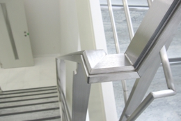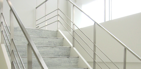 光が多く差しこむ窓が近い階段に、ステンレスのシルバーカラーと、シャープな手摺のラインが現代的です。